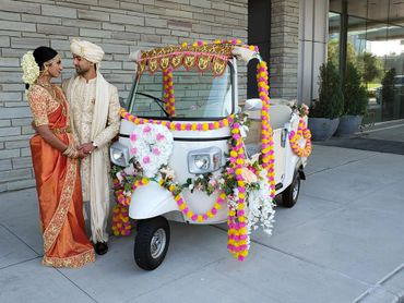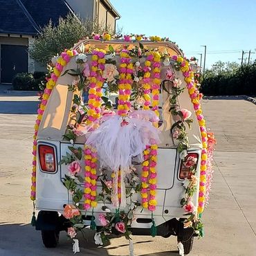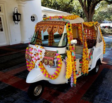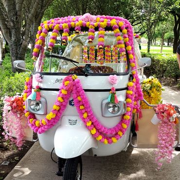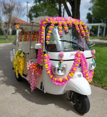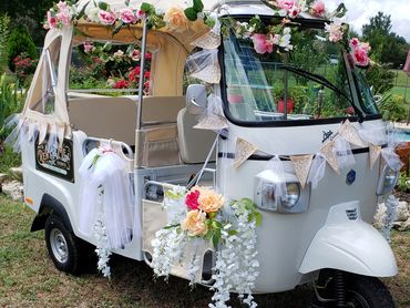 We have this beautiful white 2019 Piaggio Ape Taxi for rent. We decorate to please in many different color combinations.